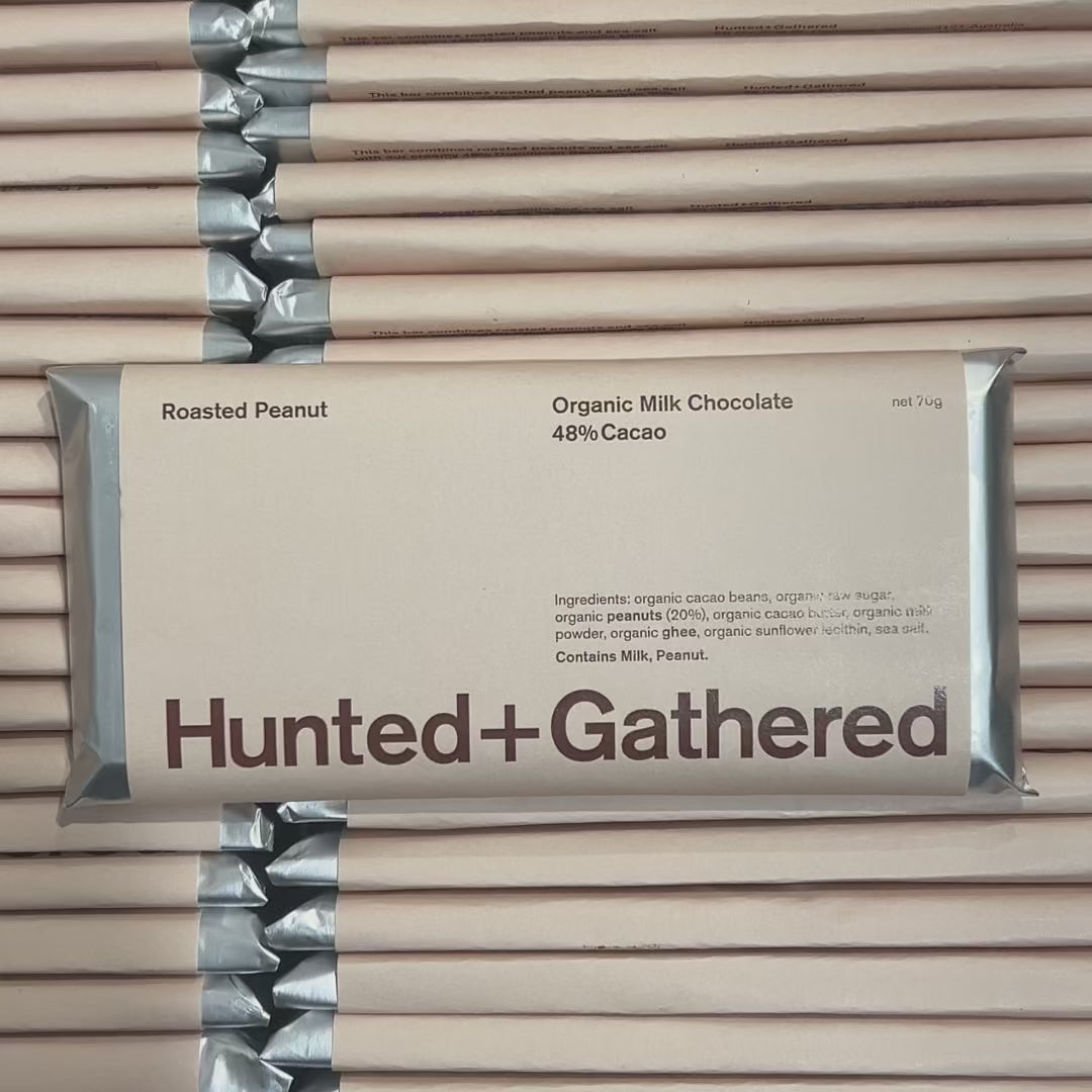 • Our philosophy ensures that every piece of Hunted+Gathered chocolate offers a distinct experience that celebrates the natural taste of the cacao bean. It’s a philosophy that guides Hunted+Gathered in creating chocolate that invites our customers to savour the pure, rich flavours of cacao, with each bar serving as a reminder of the beauty of minimalism.